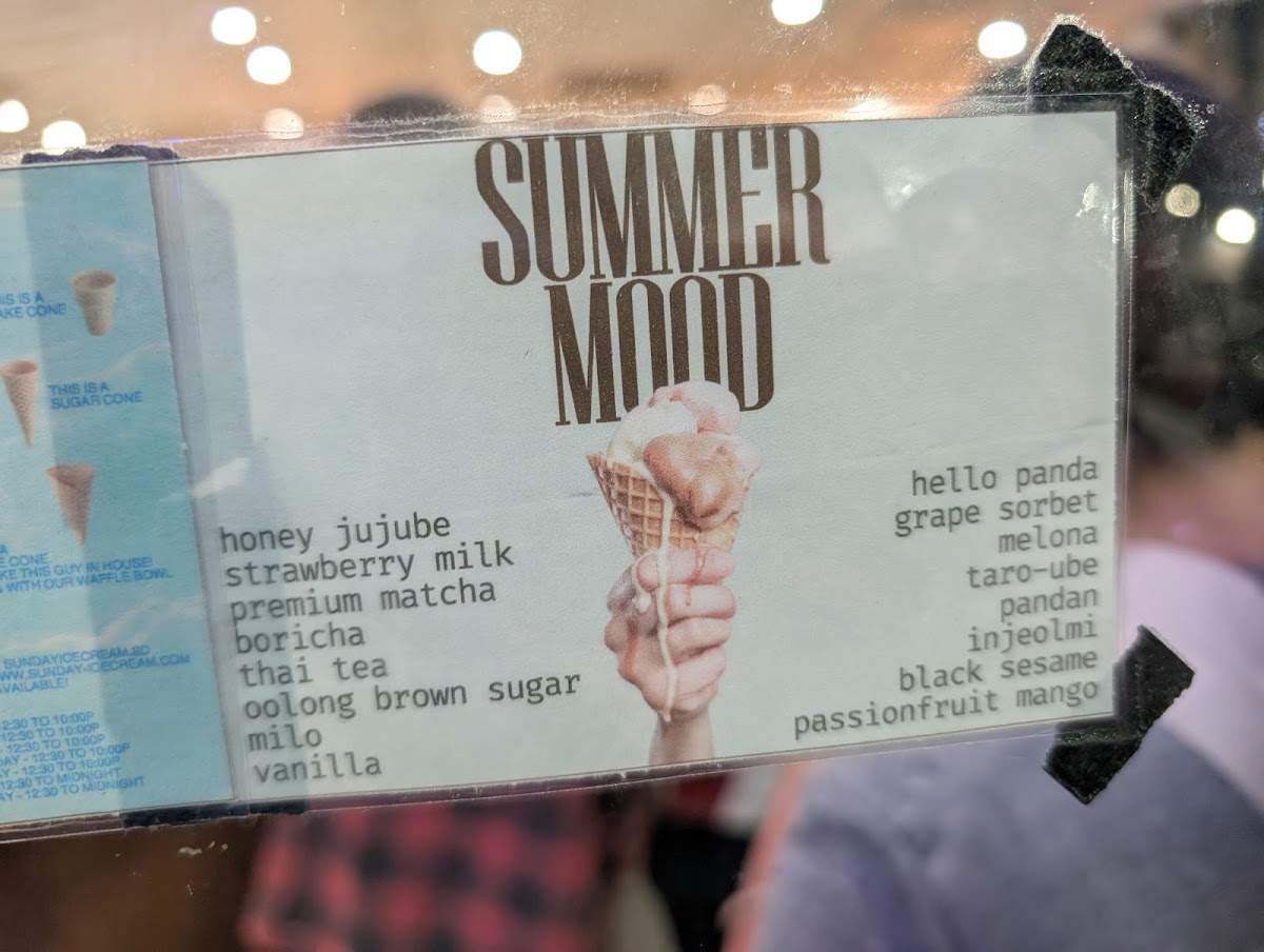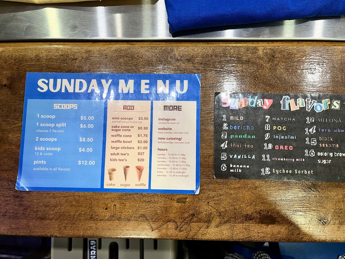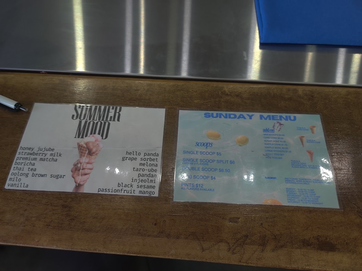 The menu offers a variety of ice cream options featuring unique and Asian-inspired flavors. Customers can choose from single and double scoops, split scoops, and kids-sized servings. For those looking to take their dessert home, pints are also available.