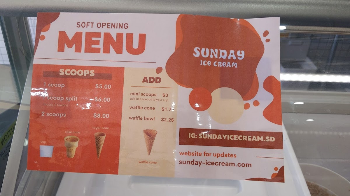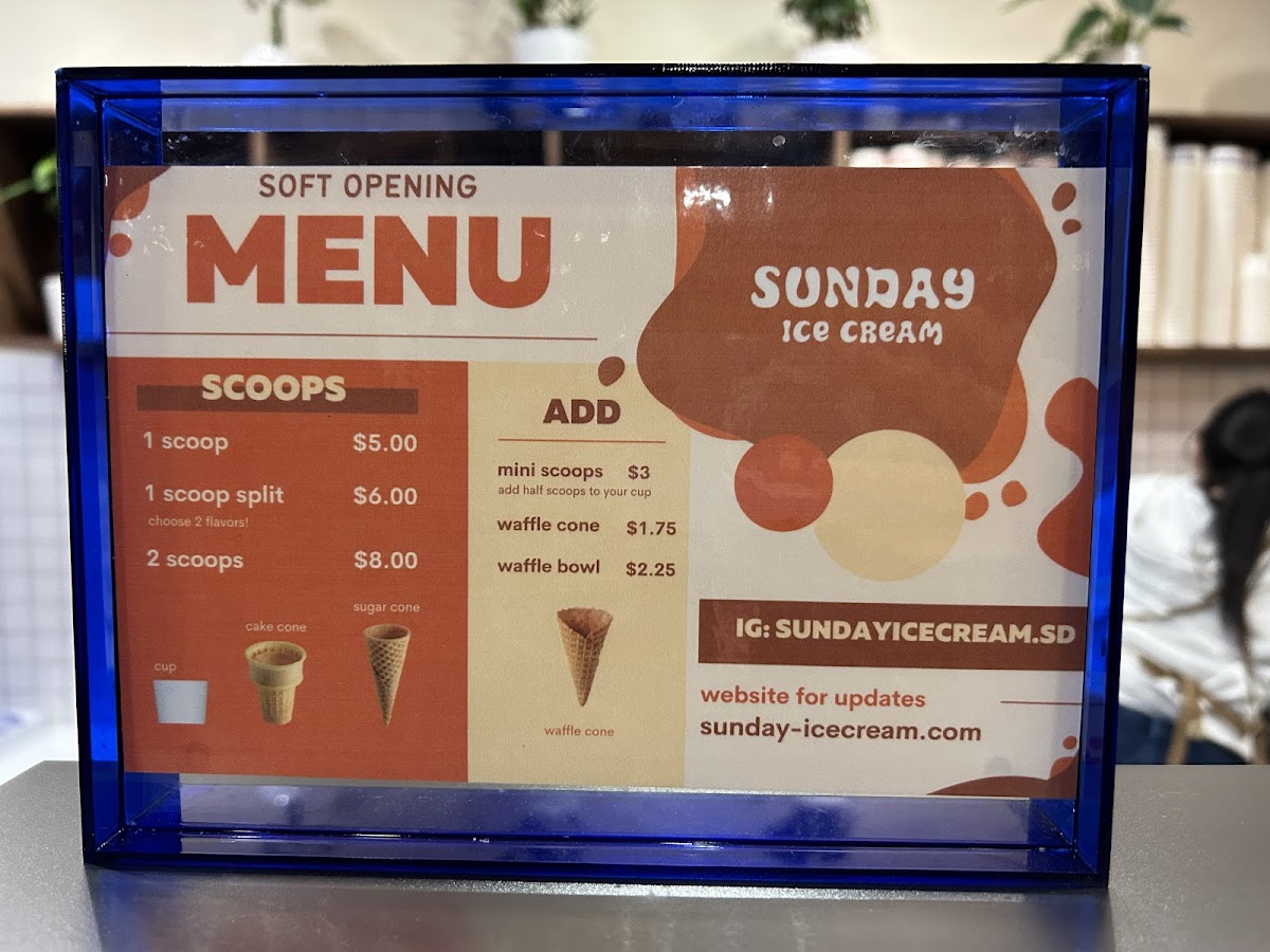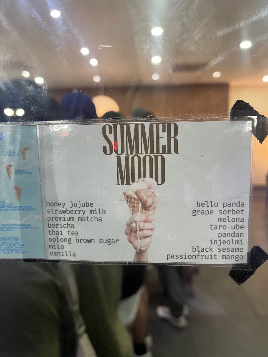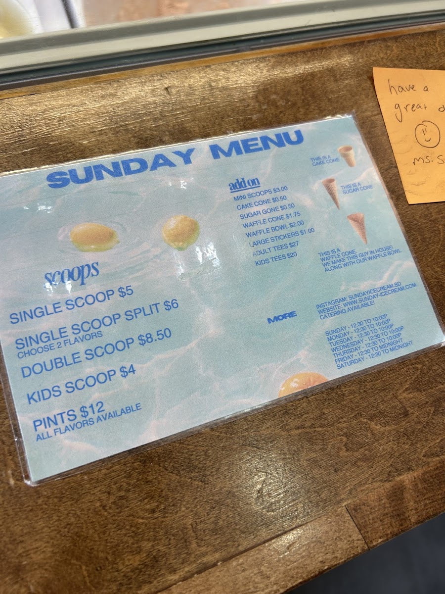 The menu offers a variety of ice cream options featuring unique and Asian-inspired flavors. Customers can choose from single and double scoops, split scoops, and kids-sized servings. For those looking to take their dessert home, pints are also available.
